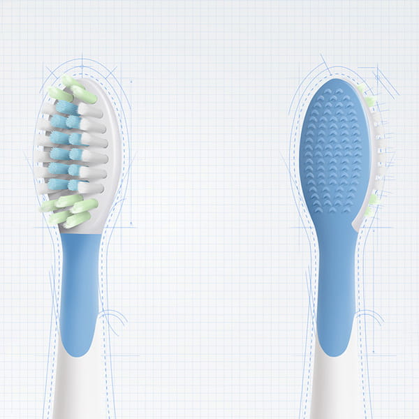 - Kolor biały - linia dziąseł: Podwójnie rozszczepione włosie o zaokrąglonej końcówce delikatnie czyści wzdłuż linii dziąseł.