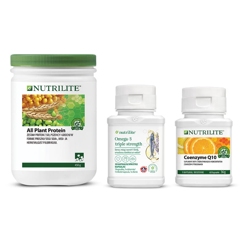 Zestaw Dojrzały wiek Nutrilite™ to unikalna kompozycja suplementów diety skierowanych do osób w dojrzałym wieku. W jego skład wchodzą trzy produkty: All Plant Protein, Omega-3 Complex i Koenzym Q10. Każdy z nich ma za zadanie wspierać prawidłowe funkcjonowanie organizmu, dostarczając mu najważniejszych składników odżywczych. Dzięki temu produktowi, codzienna dieta staje się bogatsza o białka roślinne, kwasy tłuszczowe omega-3 i koenzym Q10, które przyczyniają się do utrzymania dobrej kondycji serca i optymalizacji metabolizmu energetycznego.